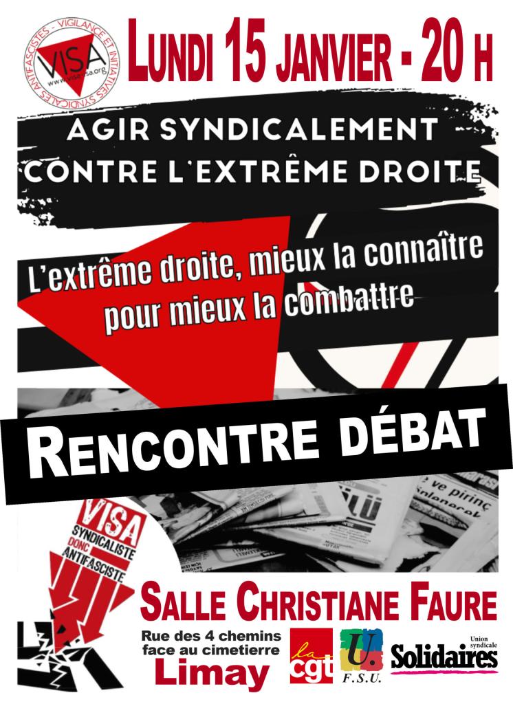 À l’initiative de la CGT, de la FSU, de Solidaires et de Visa, rencontre débat “Agir syndicalement contre l’extrême droite” lundi 15 janvier.