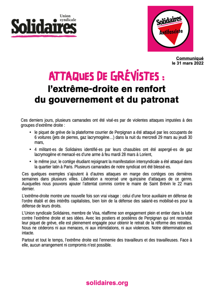 L’Union syndicale Solidaires, membre de Visa, réaffirme son engagement plein et entier dans la lutte contre l’extrême droite et ses idées. Avec les postiers et postières de Perpignan qui ont reconduit leur piquet de grève, elle est pleinement engagée pour obtenir le retrait de la réforme des retraites. Nous ne céderons ni aux menaces, ni aux intimidations, ni aux violences. Notre détermination est intacte.