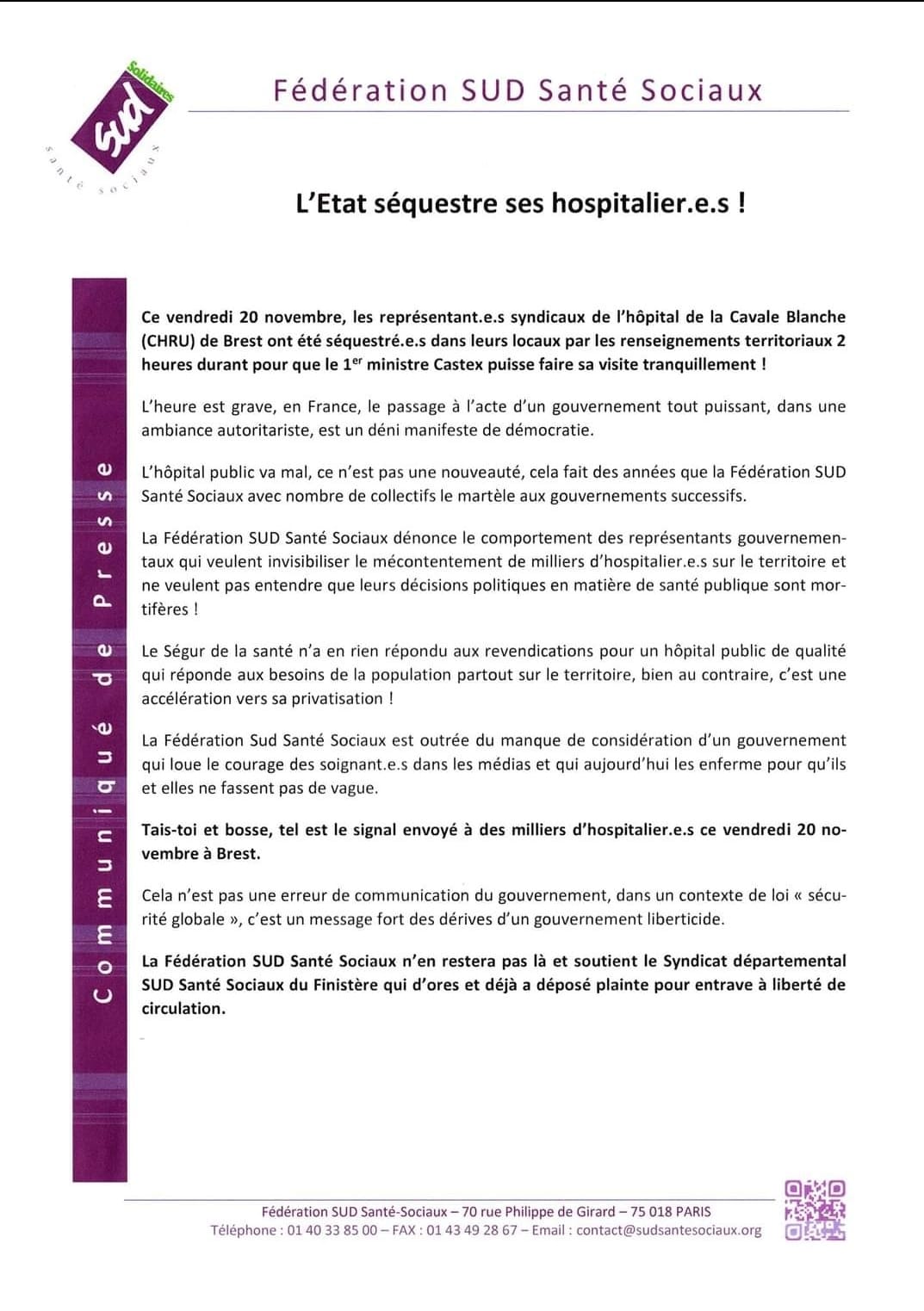 Vendredi 20 novembre, les représentant.e.s syndicaux de l’hôpital de la Cavale Blanche (CHRU) de Brest ont été séquestré.e.s dans leurs locaux par les renseignements territoriaux 2 heures durant pour que le 1er ministre Castex puisse faire sa visite tranquillement !