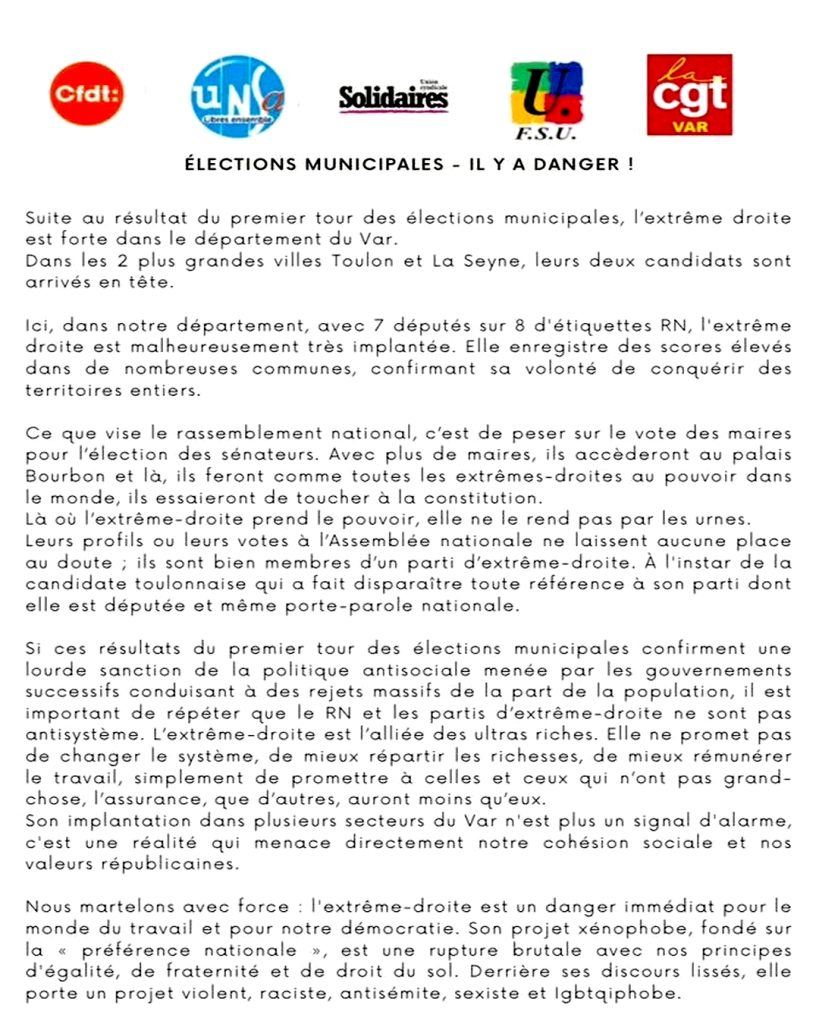 Nous, organisations syndicales sarthoises, affirmons avec gravité que l’arrivée du RN à la mairie de La Flèche serait humainement violente et constituerait une catastrophe sociale, économique, écologique et démocratique.