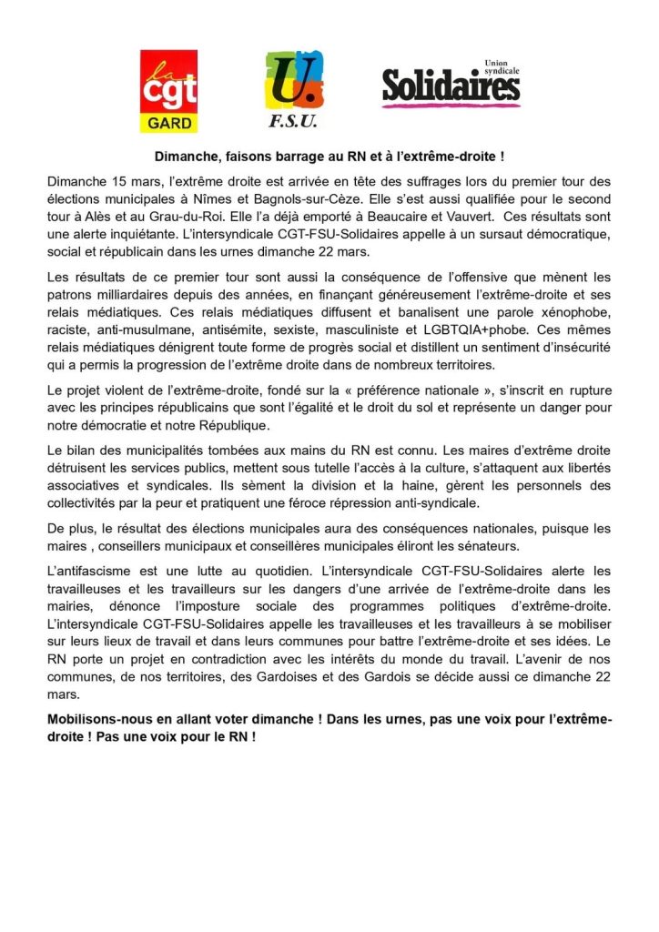Intersyndical Gard : Dimanche, faisons barrage au RN et à l’extrême-droite !