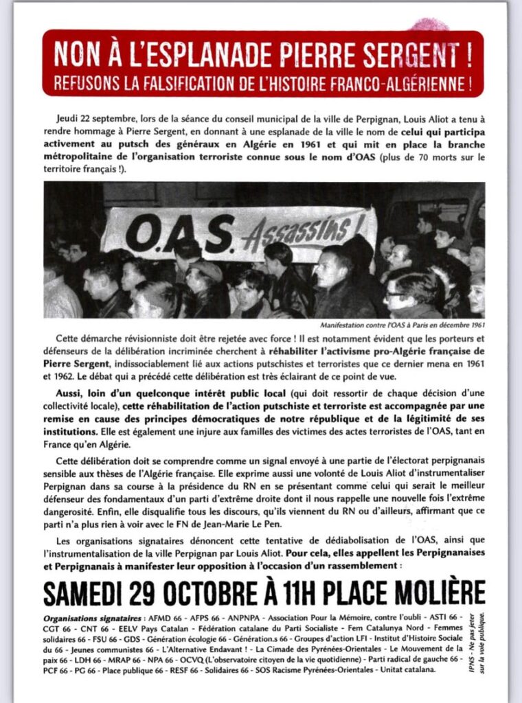 Les organisations signataires dénoncent cette tentative de dédiabolisation de l’OAS, ainsi que l’instrumentalisation de la ville Perpignan par Louis Aliot. Pour cela, elles appellent les Perpignanais et Perpignanaises à manifester leur opposition à l’occasion d’un rassemblement le samedi 29 octobre à 11h place Molière.