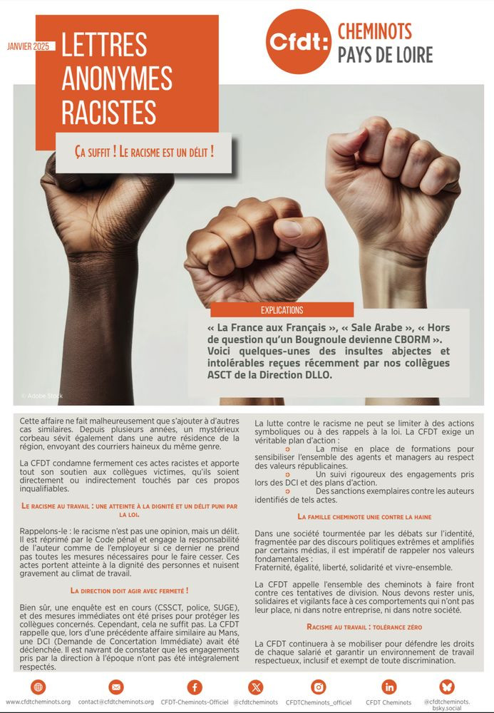 CFDT Cheminots Pays de la Loire : Lettre anonymes raciste. Ça suffit ! Le racisme est un délit !