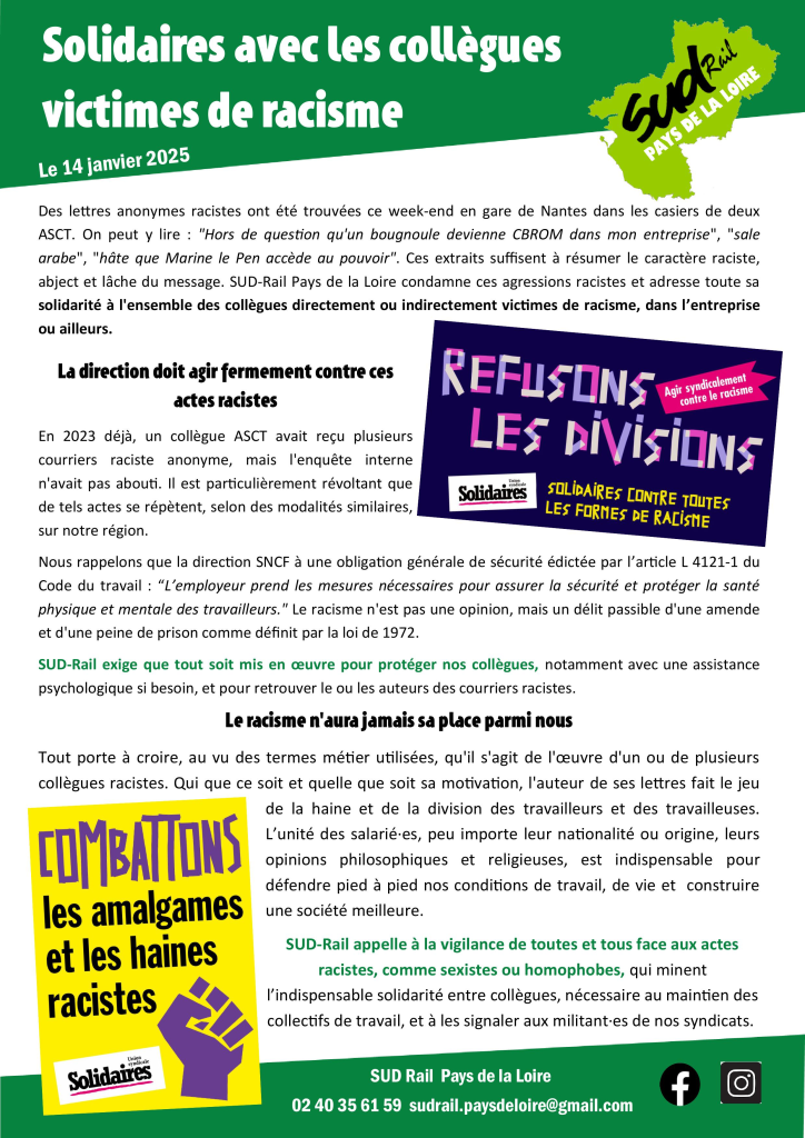 SUD-Rail exige que tout soit mis en œuvre pour protéger nos collègues, notamment avec une assistance psychologique si besoin, et pour retrouver le ou les auteurs des courriers racistes.