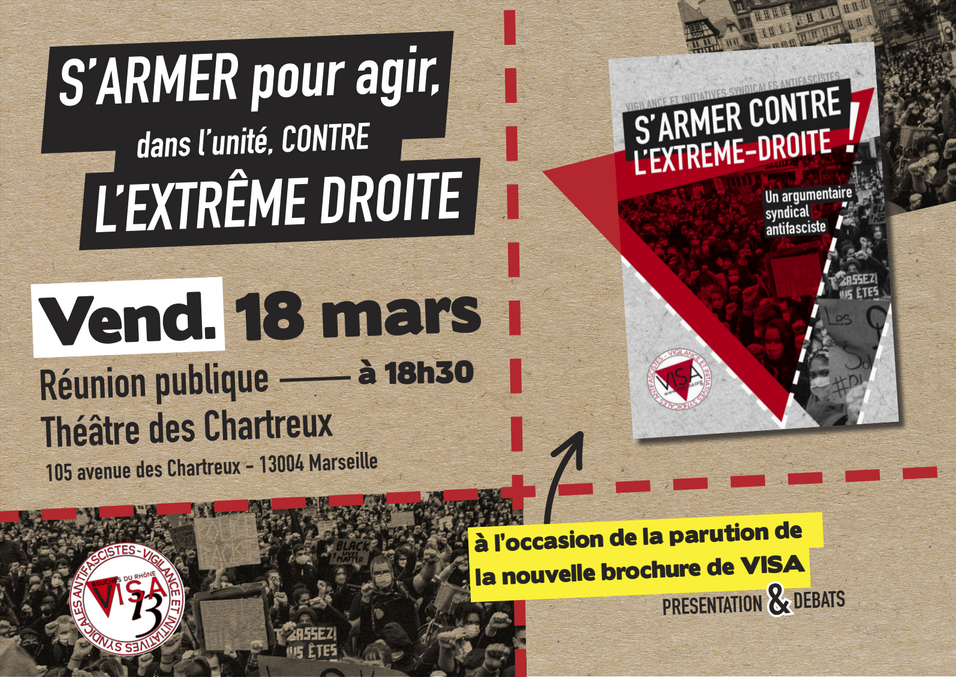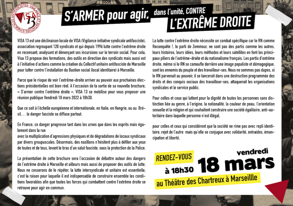 A l’occasion de la sortie de la brochure de VISA « s’armer contre l’extrême droite », VISA 13 organise une réunion publique le vendredi 18 mars à 18h30, au Théâtre des Chartreux à Marseille.
